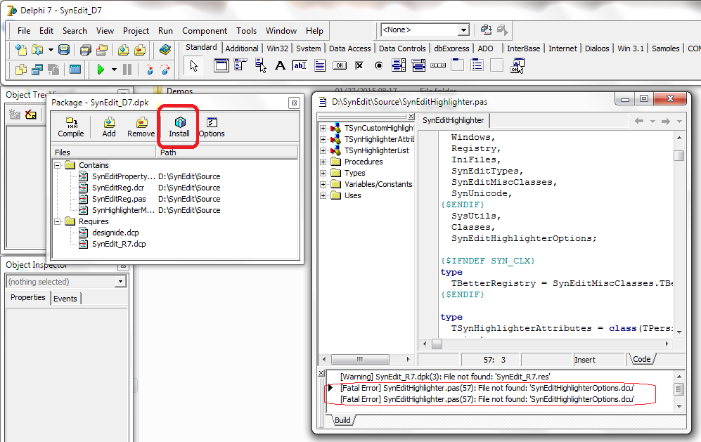 我应该添加源文件路径到Delphi库路径 (Tools \ Environment选项),然后构建没有问题!我构建了没有SynEdit_D7.dpk的SynEdit_R7.dpk。