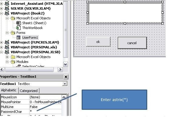 使用UserForm创建一个具有Textbox的用户表单,textbox属性中的两个按钮在PasswordChar框中输入*