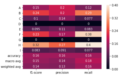 target_names = list("ABCDEFGHI")用classification_report调用output_dict=True