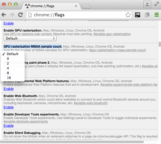 有时,您可以更改Chrome中的MSAA示例计数。转到网页chrome://标志,并查找"GPU光栅化MSAA示例计数“。