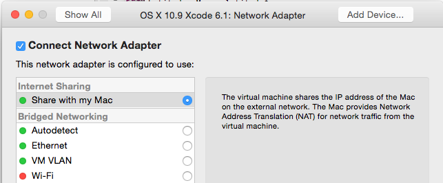 我选择了Bridged Networking - Autodetect而不是Share with Mac。这个选项可以通过我问题中提到的选项来选择,也可以通过选择顶部的菜单和选择Virtual Machine > Network Adapter > Bridged (Autodetect)来选择。