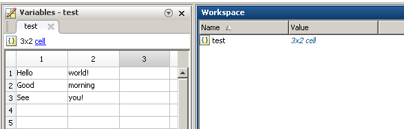 test = {'Hello', 'world!'; 'Good', 'morning'; 'See', 'you!'};
