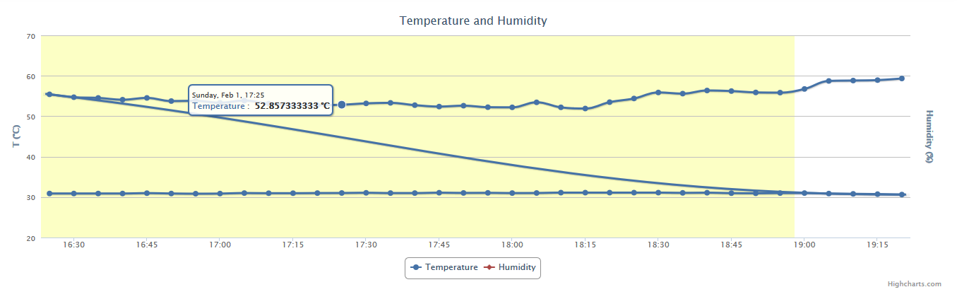 我正在做一个周末的项目,用DHT22传感器和我的raspberryPi来监测温度和湿度。阅读的效果很好,现在我试着用高图表来描绘所有的东西。