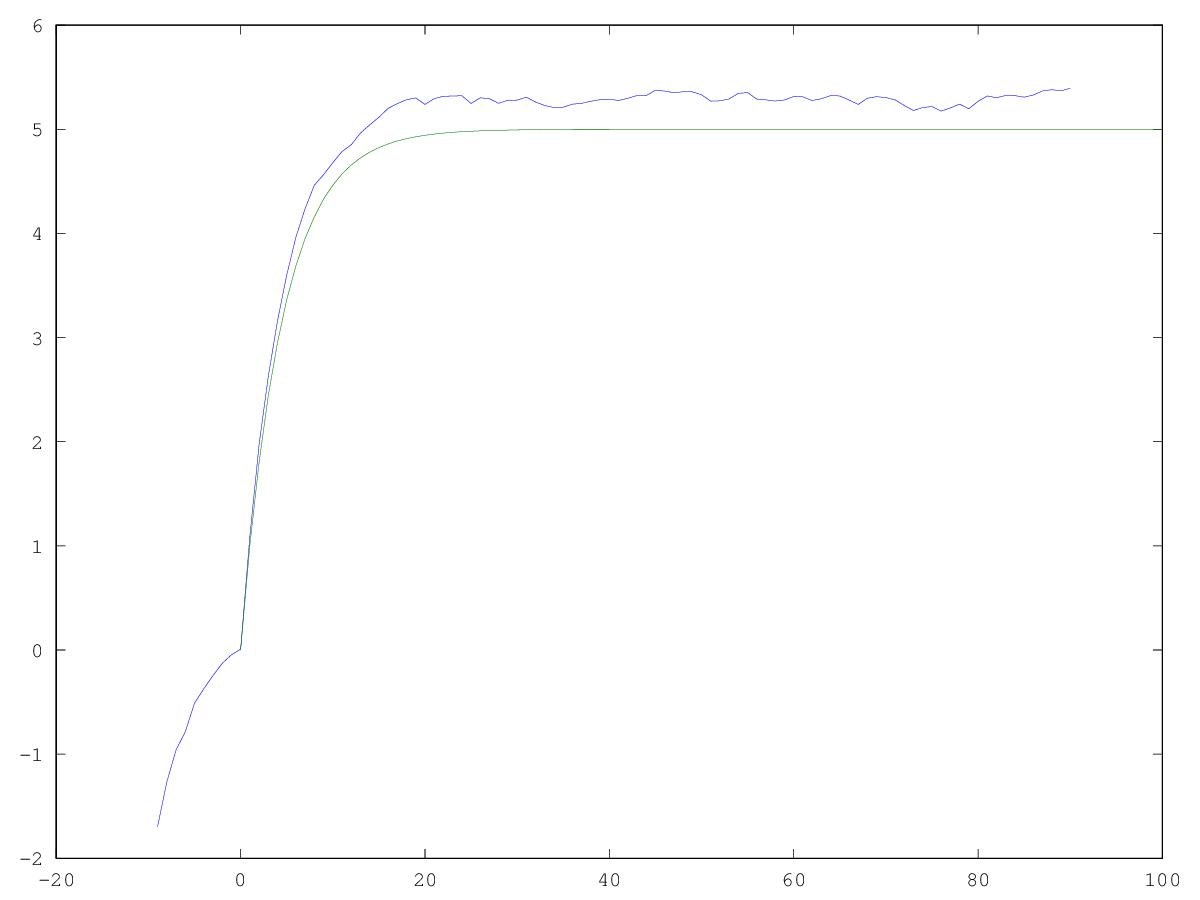 plot(t-10,ym-2.2,tt,yy)您会注意到,我已经放弃了10之前的时间值,并将响应值降低了大约2.2。这给出了以下情节(以八度音阶表示):