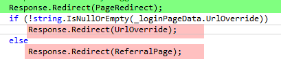 大多数代码分析器在HttpResponse.Redirect(url)未被执行后不会找到代码,所以编译器/分析器会抱怨红色代码可能是错误的。