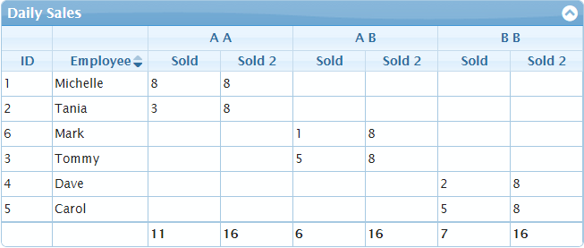 { id: "4", product: "B B", sold: "2", sold2: "8", sold3: "8", emp: "Dave" },