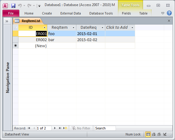 然后ID字段的Format属性"ER"000将导致它以类似于ER001的形式出现在Access窗体和数据表视图中。