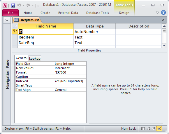 但是,在Design (第一个屏幕截图)中,请注意该字段仍然是一个自动数字字段,其“字段大小”为Long Integer。值本身只是数字;它们只是在Access用户界面中被格式化为字母数字。