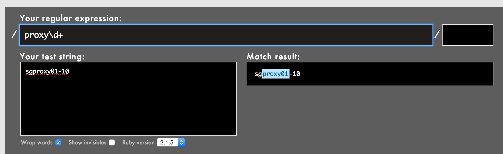 /\A\S+?proxy\d+/ Sidenote:通常最好在字符串的开头使用\A匹配,而不是^。