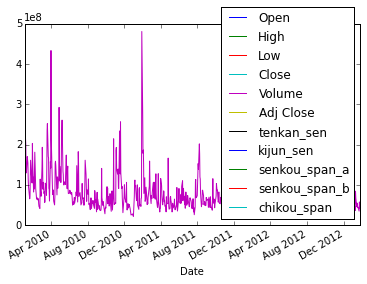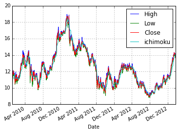 Length: 771调用data[['High', 'Low', 'Close', 'ichimoku']].plot()的结果如下所示: