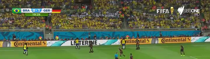 我的项目是设计一个分析足球视频的系统。在这个项目的一部分,我需要检测球员和每个人在游戏领域的轮廓。对于所有没有与广告广告牌遮挡的球员,我使用了球场的颜色(绿色)来检测轮廓和提取球员。但我对球员或裁判员对广告牌遮挡的情况有异议。假设广告牌上的广告是动态的(LED广告牌)。正如你所知道的,在这种情况下,找出轮廓是更困难的,因为没有静态背景颜色或纹理。您可以在下面的图像中看到此条件的两个示例。