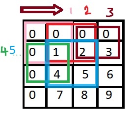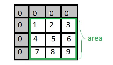 (second 1x1 square, third 1x1 square)假设我们有一个3行3列的区域。我们增加一个额外的行和列来简化计算(零平方在边界之外,因此没有单位在其中)。