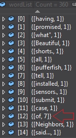 我的程序的功能是统计文档中出现的唯一单词,然后按排序顺序显示它们。我首先循环遍历所有的单词并将它们输入字典,然后在字典中增加遇到它们的次数。然后,我将字典转换为一个列表,并使用一个.Sort作为参数调用IComparer方法。如下代码所示: