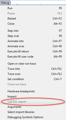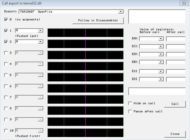 但是,如果目标是DLL中的导出函数,则可以在Ollydbg中使用“调用DLL导出”功能。使用“调用导出”功能,您可以调用带有参数的导出函数,如下面的屏幕截图所示。