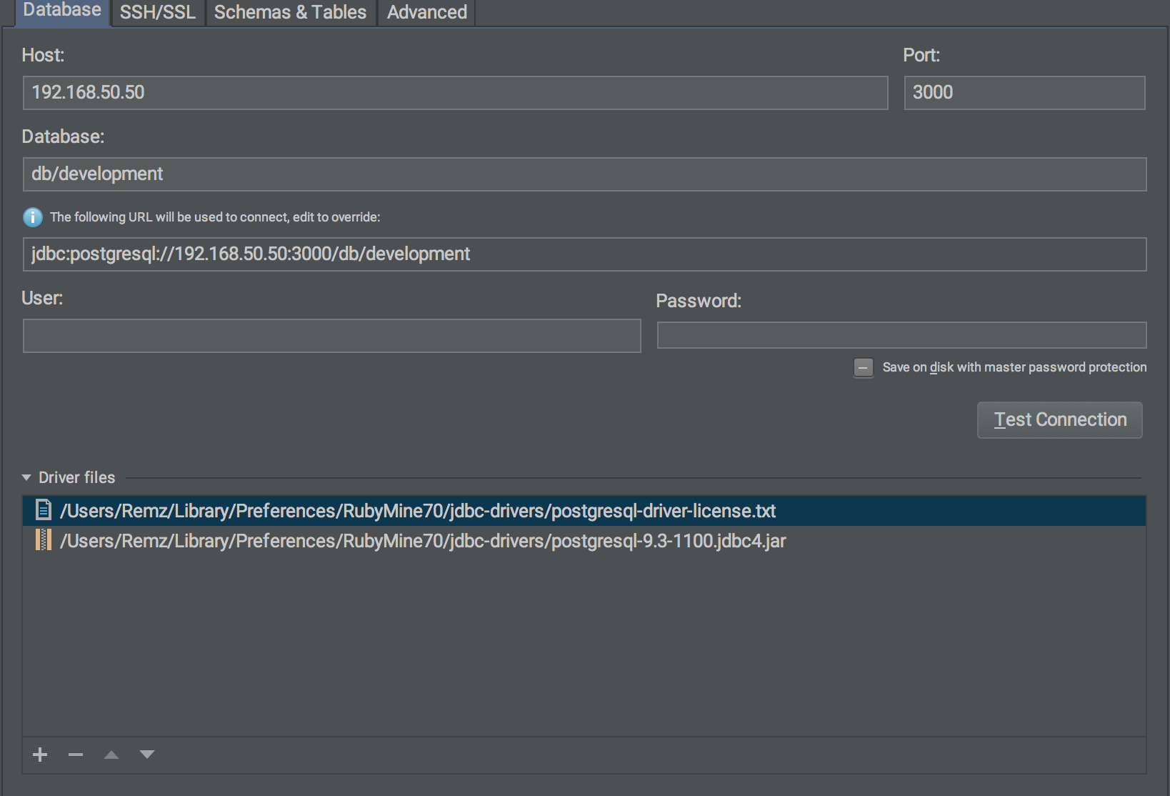 config.vm.network :private_network, ip: '192.168.50.50'这就是我在Rubymine中的DB设置的样子。