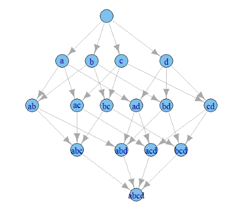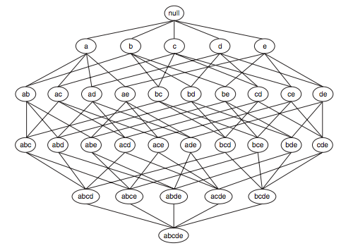 问候:这个图表应该是非常简单的东西,使用igraph为R。我正在试图找出我需要传递的参数,以获得子模式和超级模式之间的边。在本例中,表示由5个项组成的项集。