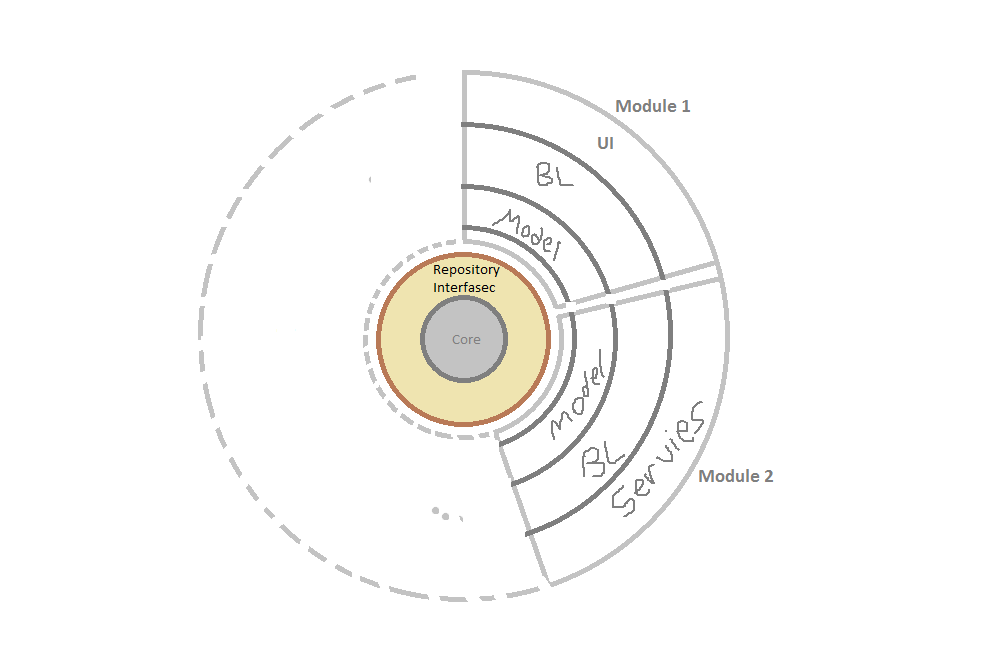 它是一个洋葱架构,但是数据库的实体将在每个模块中定义。每个模块将由一个单独的小组开发。它们之间没有依赖关系,但是我们的数据库是相同的!