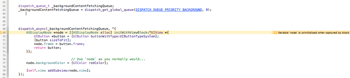 我正在开发一个IOS应用程序。我使用Facebook AsyncDisplayKit库。我想在ASNodeCell Bu中设置一个按钮,当被块捕获时,我得到“变量‘节点”未初始化。如何在ASNodeCell中添加UIButton或UIWebView控件。请帮助我。