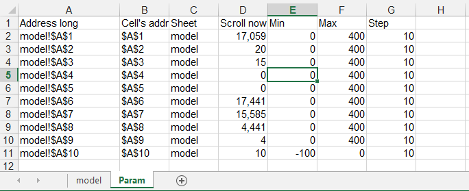 End Function在工作簿中,必须生成名为Param的工作表,其中存储滚动条的参数。在A和C列中,将工作表的名称放在希望滚动条出现的位置。这张纸是这样的: