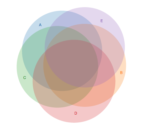我正在使用venn.js尝试可视化5路数据.我使用的数据来自R的VennDiagram包。但不知何故它没能出现。大多数例子都是使用偶数的集合,奇数有什么特别之处吗?