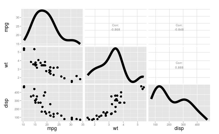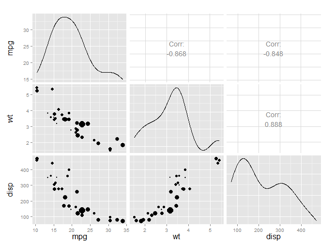 ggpairs(mtcars[ ,c("mpg", "wt", "disp")],