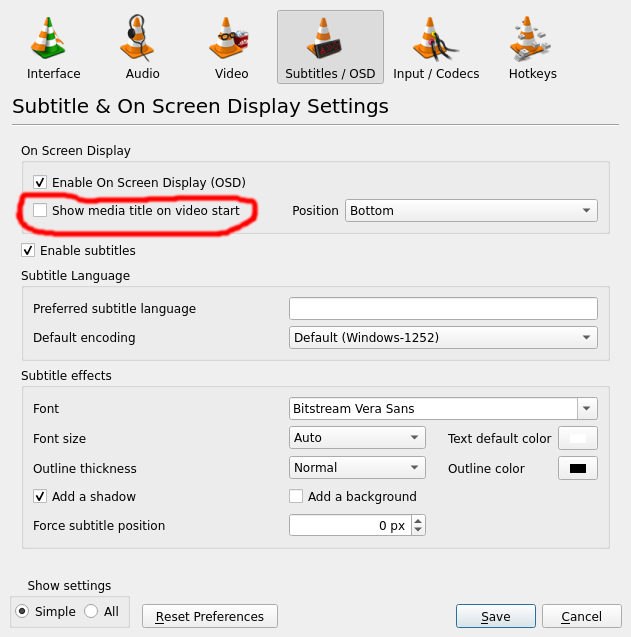 Tools → Preferences → Subtitles/OSD → Uncheck "Show media title on video start" → Save