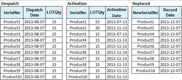 我想从多个表中提取基于匹配的结果,三个表是特定的。这些表是Despatch,Activation和Replaced.下图显示了它们中的结构和样本数据。