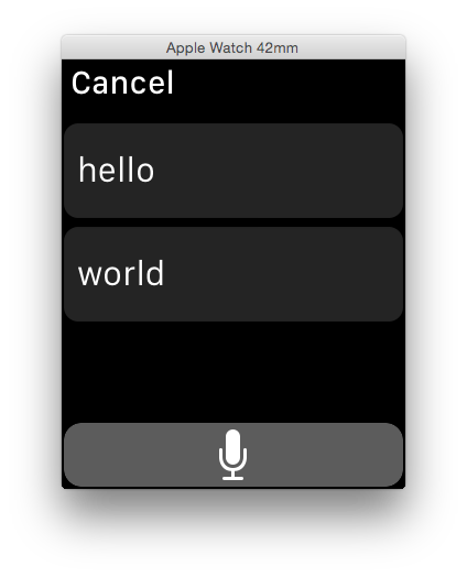 [self presentTextInputControllerWithSuggestions:@[@"hello", @"world"] allowedInputMode:WKTextInputModePlain completion:^(NSArray *results) {