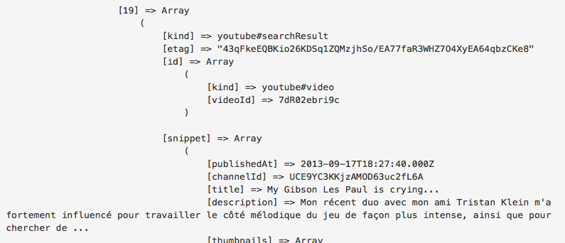 因此,现在为了获得一个完整的描述,我将向YouTube API发送另一个调用。我给$youtube->videos->listVideos('snippet',array('id' => '7dR02ebri9c'))打电话。调用成功,但不包含任何片段数据。
