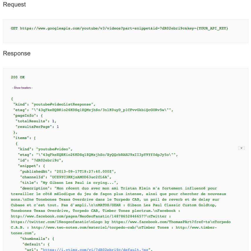 如果我通过YouTube API资源管理器运行相同的请求,我会收到一个包含片段数据和完整描述的响应。