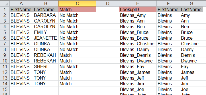 =ISERROR(MATCH(A2,worksheet2!A:A,0))我想要做的是看看FirstName AND LastName在一个工作表中是否与FirstName AND Lastname匹配,在另一个工作表中是否匹配(我正试图在worksheet1中找到新记录)。