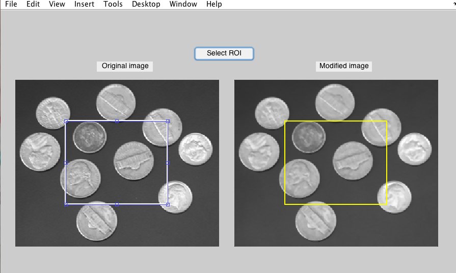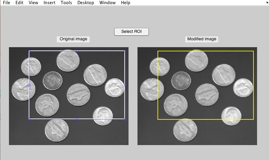 在下面的图中,我创建了两个轴。左边是原始图像,右边是“修改”图像。通过按下按钮,调用imrect,addNewPositionCallback方法执行一个名为GetROIPosition的函数,该函数用于获取由imrect定义的矩形的位置。同时,在第二轴上,用与第一轴相同的位置绘制矩形。更别提的是,您可以使用setConstrainedPosition强制将矩形包围在给定的轴中。我让您这么做:)下面是包含两个屏幕截图的整个代码: