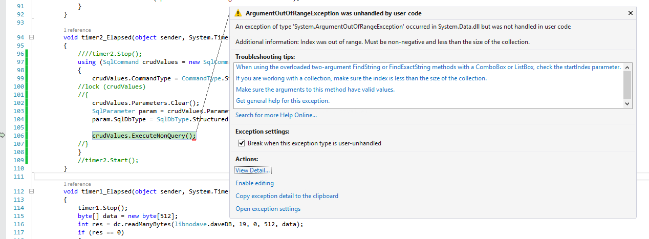 我有两个定时器。其中一个计时器从plc检索数据并更新datatable中的相关数据行。在另一个计时器中,我将datatable作为参数发送到存储过程。问题是,有时我的sqlCommand.ExecuteNonQuery()会给我一个ArgumentOutOfRangeException。数据表中有128行。我从plc中读取了512字节。一行表示一个浮点数(这意味着4个字节)