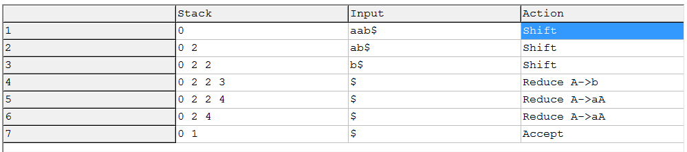 我使用免费软件工具"ParsingEmu“生成LR表,并在下面对单词"aab”执行LR评估。如您所见,列头包含标记。从计算中可以看到,解析器通过查看下一个输入令牌来决定使用哪一列。但是,当解析器在步骤4-6中减少时,输入不会改变(尽管解析器在执行到下一个状态的转换时需要知道下一个输入令牌"$“)。