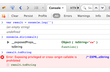 toString()功能实际上是Firebug内部代码和火狐安全机制的一部分,禁止网站和命令行访问它。console.dir()仍然列出了该函数,因为它在特权范围内运行。