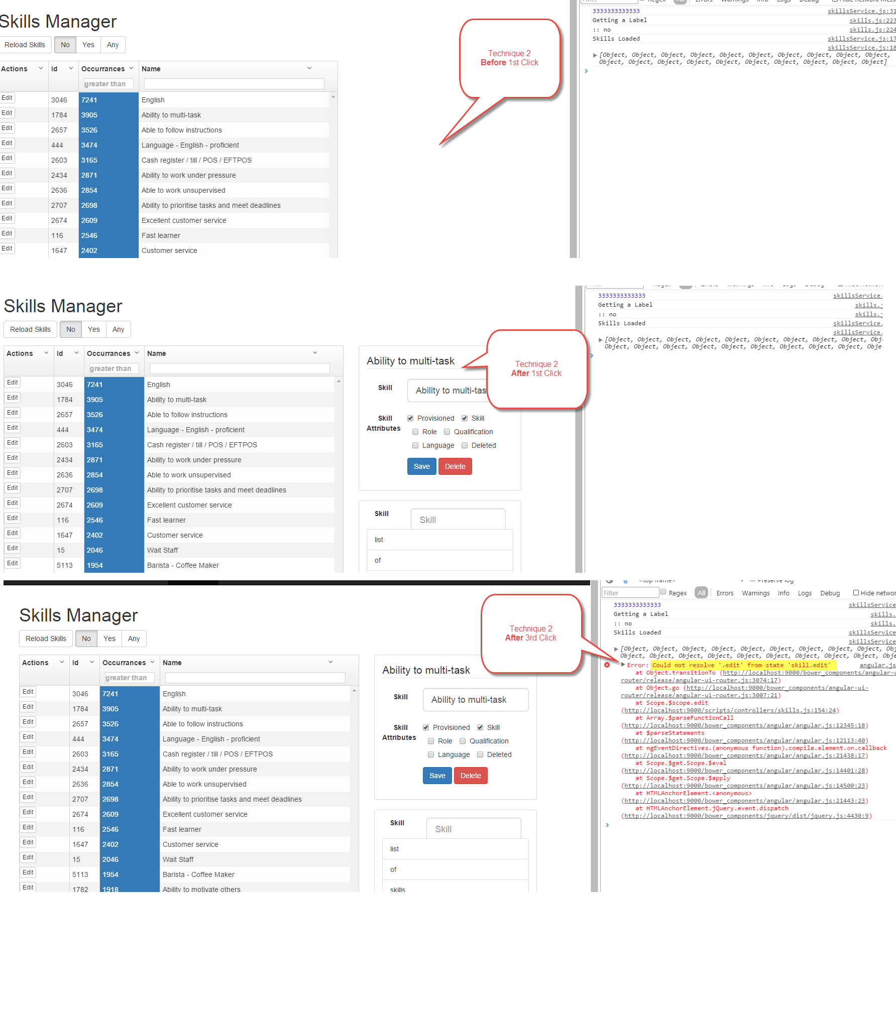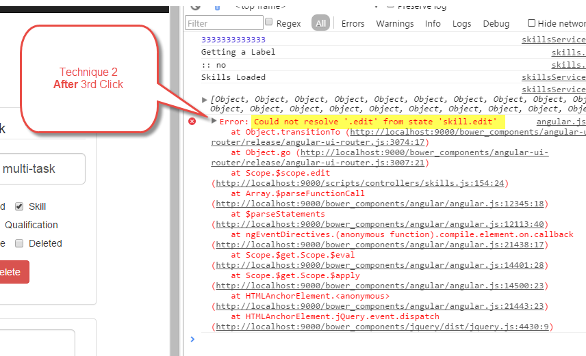 当您尝试在控制器中执行此操作时,一旦状态已更改为skill.edit,您将告诉它进入相对.edit状态,该状态将解析为skill.edit.edit