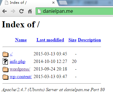 在新年开始的时候,我买了一个域名:danielpan.me。在中创建了一个之后,我在远程服务器上部署了wordpress。我遵循的教程是这里。但我不明白发生了什么。删除/var/www/html/index.html,文件后,我的服务器显示如下: