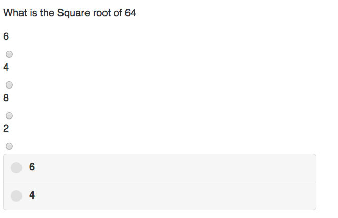 我在jquery构建一个学习回复system.Now时遇到了一些严重的问题,我想在每次有一个问题要回答的时候动态填充问题页面。到目前为止,我已经能够做到所有这些,但目前,当我动态调用它们时,我的单选按钮拒绝遵循正常的jquery顺序。当我动态调用设计中断时,当我硬编码时,我就得到了预期的结果。下面的图片是wat试图解释的一个例子。上面扭曲的单选按钮是动态的,下2是硬编码的。