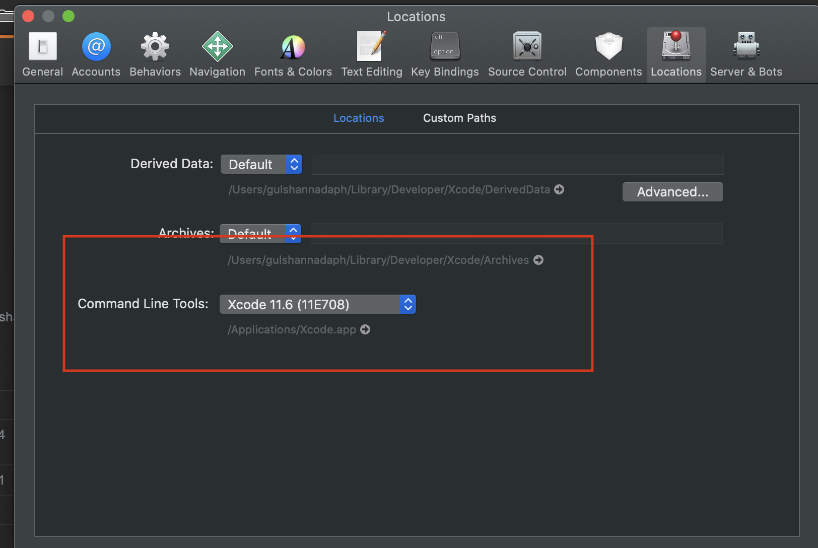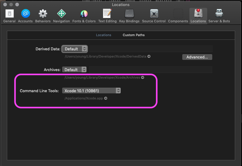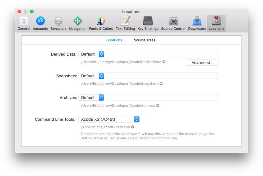 在Xcode中,在顶部打开Xcode菜单,然后选择Preferences…,然后选择Locations选项卡。