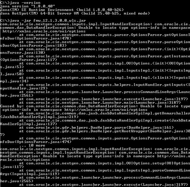 C:>java -version java版本"1.8.0_40“Java(TM) SE运行时环境(Build1.8.0_40-b26) Java HotSpot(TM) 64位服务器VM (Build25.40-b25,混合模式) com.oracle.cie.nextgen.common.inputs.impl.InputHandlerException: C:>java -jar fmw_12.1.3.0.0_wls.jar com.oracle.cie.com.oracle.cie.nextgen.common.inputs.parser.OptionsParser.getOptionsI nfoDao(OptionsParser.java:478) at com.oracle.cie.nextgen.common.inputs.parser.OptionsParser.parseOption sDao(OptionsParser.java:183) at com.oracle.cie.nextgen.common.inputs.parser.OptionsParser.(Opti onsParser.java:130)的名称空间http://xmlns.oracle.com/oui/options中无法找到类型选项-info( com.oracle.cie.nextgen.common.inputs.parser.OptionsParser.getInstance (OptionsParser.java:117) at com.oracle.cie.nextgen.common.inputs.impl.OUIOptions.(OUIOption s.java:53) at com.oracle.cie.nextgen.common.inputs.impl.InputsImpl.(InputsImp l.java:50)在com.oracle.cie.nextgen.common.inputs.helpers.InputHandler.getInputs(I nputHandler.java:29),在com.oracle.cie.nextgen.launcher.Launcher.processCommandLineArgs(Launc her.java:2561),在com.oracle.cie.nextgen.launcher.Launcher.execute(Launcher.java:3197) at com.oracle.cie.nextgen.launcher.Launcher.main(Launcher.java:3187),由:com.oracle.cie引起。com.oracle.cie.common.dao.jaxb.JaxbDataHandlerSpiImpl.getUnmarshaller (JaxbDataHandlerSpiImpl.java:219):无法在名称空间http://xmlns.oracle.com/oui/options中找到类型选项-info