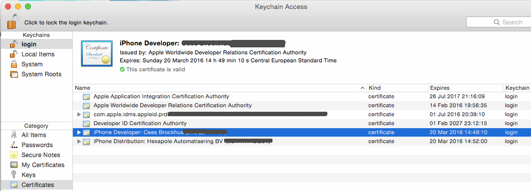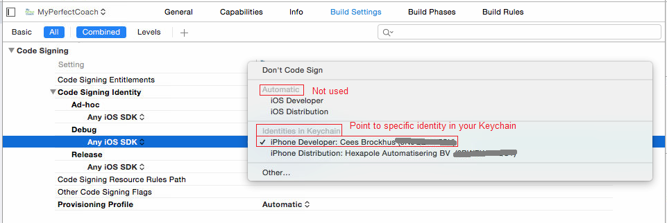 最后,在xcode中,我访问了Build Settings of my Target。在代码签名部分中,我更改了Any iOS SDK的值,以指向密钥链中的特定标识,而不是将它们放在自动上(iOS Developer / iOS Distribution)。这解决了我的问题,我能够构建/部署到我的设备,我能够上传一个新的构建到iTunes连接。