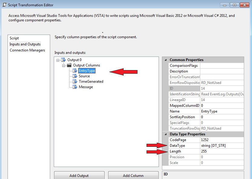 Data Flow task;Script Component,其中应该添加4个输出列(箭头显示要更改的内容):EntryType (string 255)