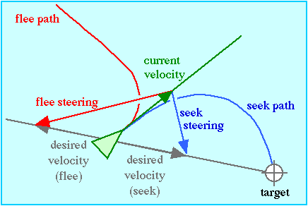 这项工作 by 克雷格·雷诺兹将行为分解为一系列模块,这些模块可以单独或一起使用来形成复杂的行为。每个模块都基于一个指导概念,其中一个实体要么转向一个目标,要么远离一个目标。