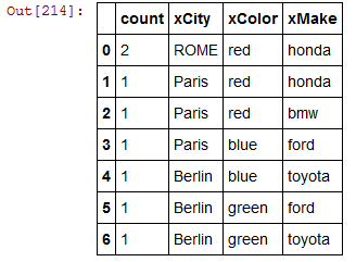 xDict = {'color': xColor, 'make': xMake, 'city': xCity, 'doc_count': doc_count}