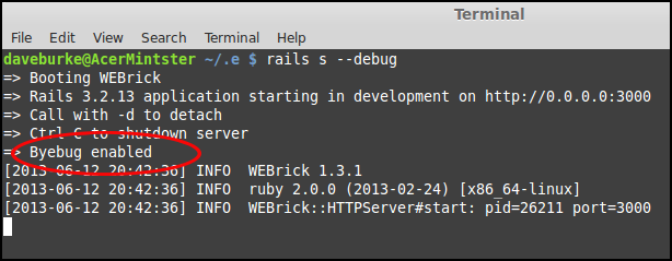您不会在浏览器中获得调试器--调用debugger或byebug会将您放到用于运行rails服务器的终端窗口中的byebug提示符中(请注意,这与rails控制台不同-您可以在rails调试指南中做些什么)。