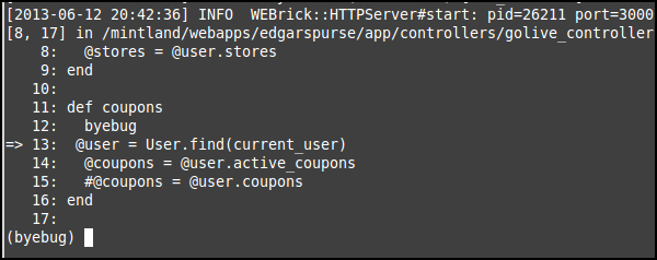 现在,尝试访问指向在代码中写入debugger的位置的页面,日志将在放置debugger/byebug单词的地方停止。