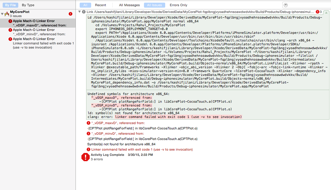 那些缺失的符号来自加速框架。最近的核心情节构建要求你的应用程序链接该框架,也。