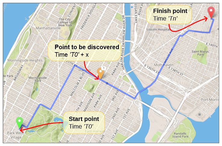 给定A点和B点之间的一条路线,从时间T0开始,以恒定的速度行驶。如下所示:
