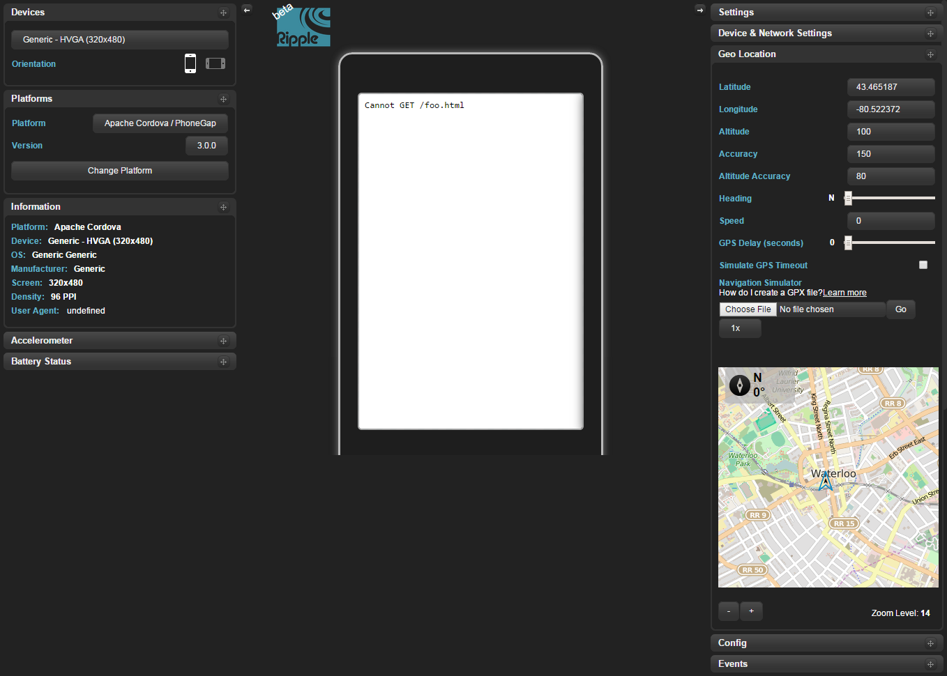 为了在模拟器之外调试phonegap应用程序,PhoneGap仿真/ Ripple允许您在桌面浏览器中进行测试。 http://emulate.phonegap.com/“波普尔驱动的PhoneGap仿真” 单击设置齿轮并检查“覆盖地理位置”。