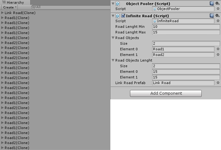 我在联合公司工作了一个月。我是新的团结和C#,在团结之前,我工作的其他游戏引擎。无论我做的是无限运行游戏,我都写了随机道路生成器。道路发电机运行良好,但我有更新道路的问题。我可以这样手动更新道路。如何自动更新?